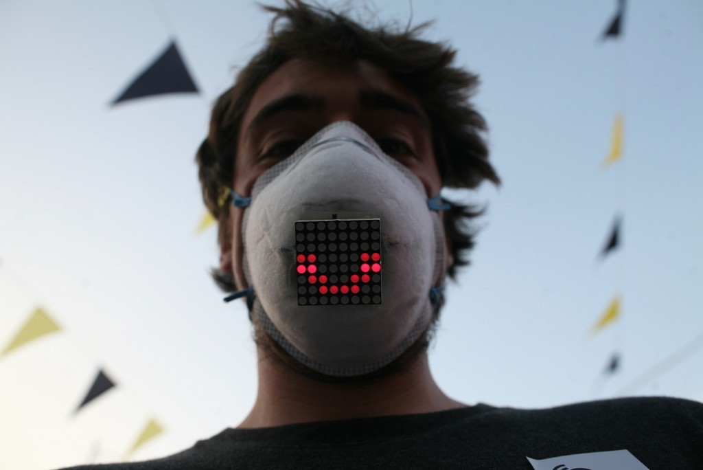 这款LED发光口罩上装设了感应器,与AirBeam空气监控系统运作,并透过蓝牙连接到AirCasting网站,能根据空污实时改变颜色。